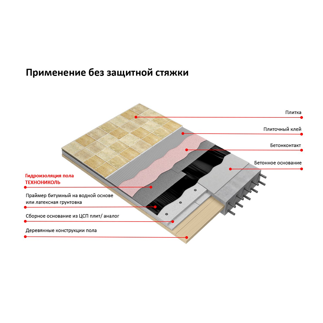 Безосновную гидроизоляцию ТЕХНОНИКОЛЬ применяют во внутренних помещениях для обеспечения водонепроницаемости перекрытий между этажами. Укладка материала осуществляется непосредственно на деревянные либо железобетонные полы. С его помощью достигается надежная гидроизоляция под керамической плиткой и стяжкой.