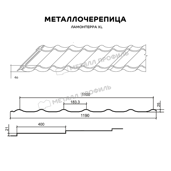 Если вы ищете классическую стальную черепицу для крупных кровель, обратите внимание на Ламонтерра® XL. Она характеризуется увеличенными габаритами: длина ступеней — 400 мм, высота — 21 мм. Крупные плавные волны подчеркнут размеры скатов и сделают кровлю более выразительной.