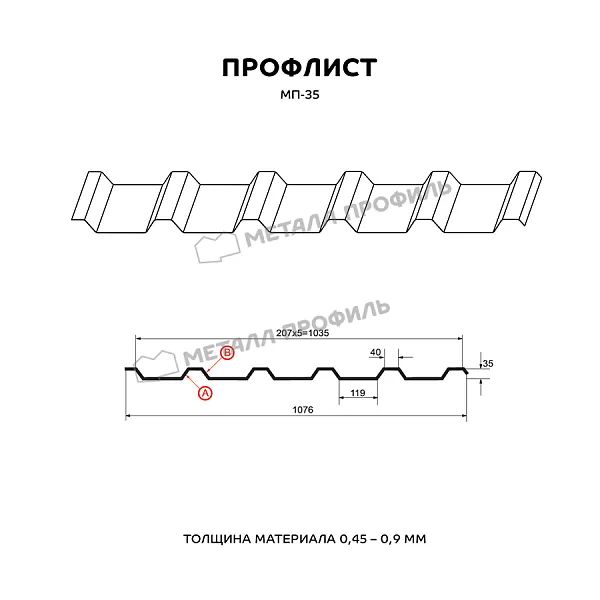 Профлист с высотой волны 35 мм. Обладает ровными полками, без многочисленных рёбер жёсткости. Но сама форма профиля с повторением узких верхних и широких нижних полок придаёт этому стройматериалу хорошую стойкость к скручиванию и прочность на изгиб. За счёт своих эксплуатационных свойств, этот профлист с успехом используется в самых разных сферах. Таких, как: перекрытие кровли, оборудование внутренних перегородок в промышленных зданиях, заливка фундамента (в качестве армирующего элемента ), создание щитовых конструкций, облицовка наружных стен, установка ограждений. МП-35 обладает небольшим весом, что заметно упрощает его перевозку и установку. Исходя из назначения гофрированного листа, вы можете выбрать необходимую толщину металла – от 0,45 до 0,9 мм.Покрытие ECOSTEEL®: