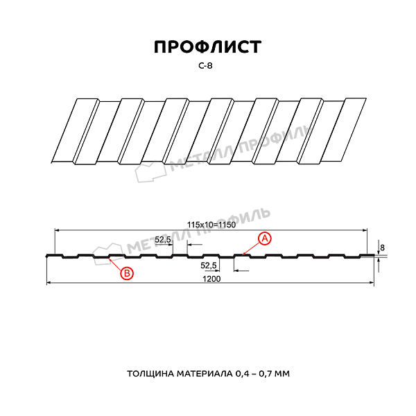 Профилированный лист с самой низкой трапецией в линейке Компании Металл Профиль. Его назначение – по большей части декоративная задача, чем прочностная. Профлист с высотой 8 мм прекрасно подходит для таких задач, как: постройка ограждений, не подверженных высоким климатическим нагрузкам, системы подвесных потолков, внутренняя облицовка индустриальных помещений, создание вентилируемых фасадов. Аналогичная с обеих сторон форма проката делает С-8 универсальным материалом для разноплановых дизайнерских решений. Оптимальная толщина металла – от 0,4 до 0,7 мм позволяет объектам из профлиста отлично справляться с любым своим назначением. А большая полезная ширина (1150 мм) помогает сэкономить на закупке профлистов. По вашему заказу мы можем изготовить листы металлопроката длиной от 0,5 до 12 метров.Покрытие Полиэстер: