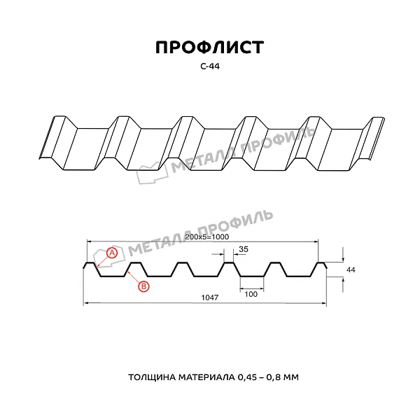 Профилированный лист С-44 может быть использован фактически в любых сферах строительства. Он одинаково востребован как в частном секторе, так и на индустриальных стройках. Профнастил с глубиной трапеции 44 мм характеризуется довольно хорошими несущими способностями. Это самый высокий из профилей с обозначением С – «стеновой». Он подойдёт, если вам нужно: возвести стены и переборки в щитовых зданиях, соорудить подсобные помещения, сделать кровельное покрытие, поставить ограждения. Также данный гофрированный лист| профиль отличается необходимой прочностью для возведения каркасов различных сооружений и несъёмной опалубки для бетонирования. Профлист С-44 разрешено устанавливать в областях с суровым климатом. Профиль этого материала несимметричен. Лицевая сторона (А) имеет более ритмичный рисунок из узких полочек и используется для кровли. Сторона В смотрится более тяжеловесно, рекомендована для прочих сфер применения.Покрытие Полиэстер: